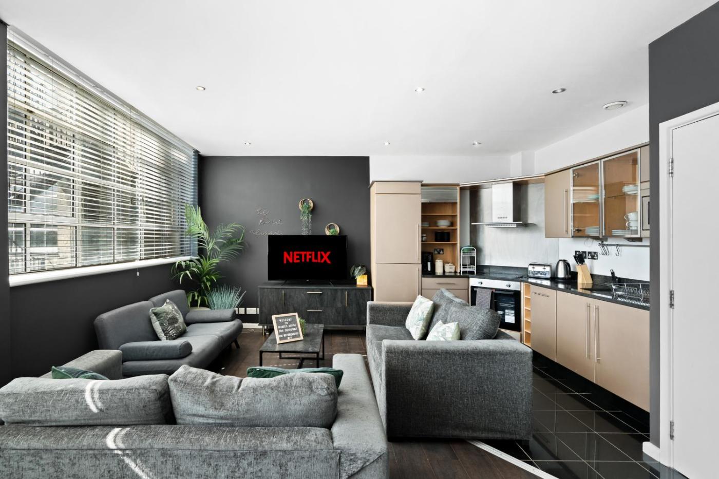 The spacious apartment features 2 bedrooms, a flat-screen TV with streaming services, a fully equipped kitchen with a dishwasher and an oven, a washing machine, and 1 bathroom with a walk-in shower. Towels and bed linen are provided in the apartment. The accommodation is non-smoking.