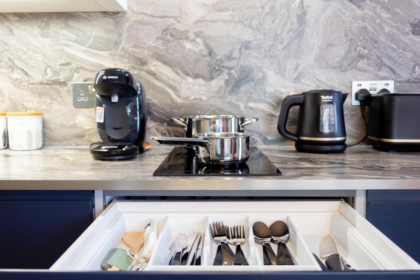 One-Bedroom Apartment. Boasting a private entrance, this apartment also comes with 1 bedroom, a seating area and 1 bathroom with a walk-in shower and a hairdryer. Guests can make meals in the kitchenette that features a refrigerator, kitchenware, a microwave and a toaster. This apartment has soundproof walls, a tea and coffee maker, flat-screen TV with streaming services, as well as chocolate for guests. The unit has 1 bed.