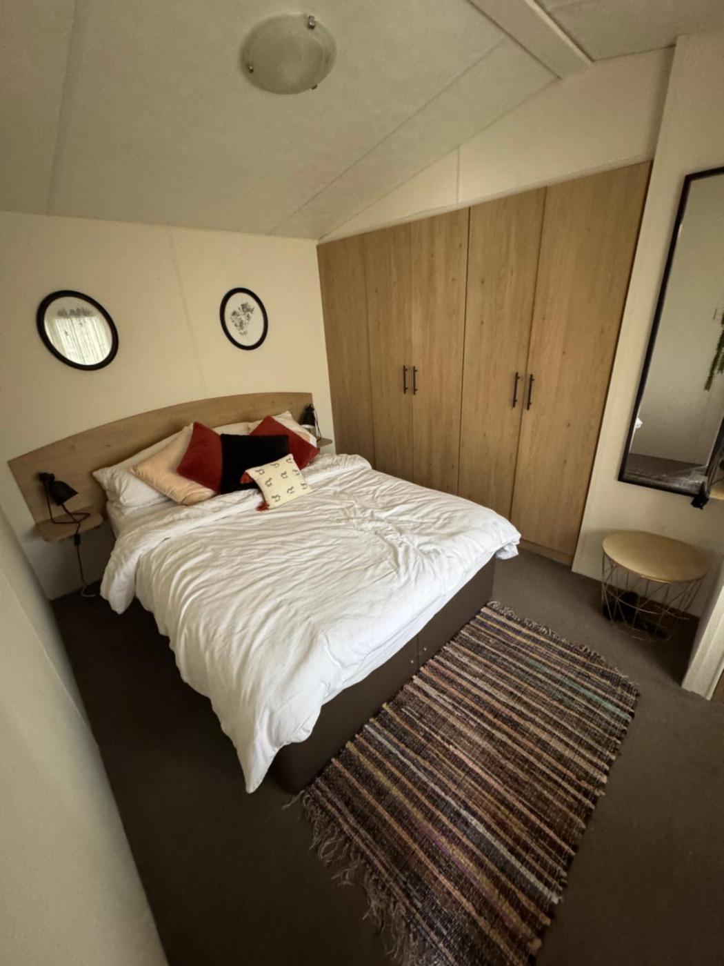 Caravan. The fireplace is the standout feature of this mobile home. This mobile home includes 1 living room, 2 separate bedrooms and 2 bathrooms with a shower and a hairdryer. Guests can make meals in the kitchen that has a stovetop, a refrigerator, kitchenware and an oven. The mobile home has carpeted floors, a seating area with a flat-screen TV with streaming services, a tea and coffee maker, a dining area, as well as a wardrobe. The unit has 4 beds.