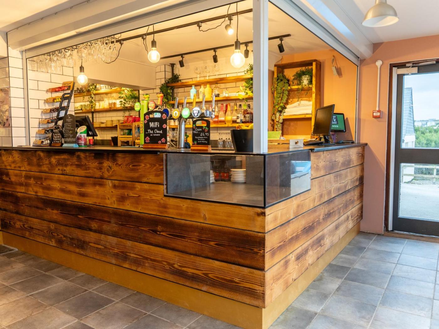 The YHA Treyarnon Bay offers guests use of shared self-catering kitchen facilities. The open-plan dining room and bar has sea views and serves traditional English meals and local ales and ciders.