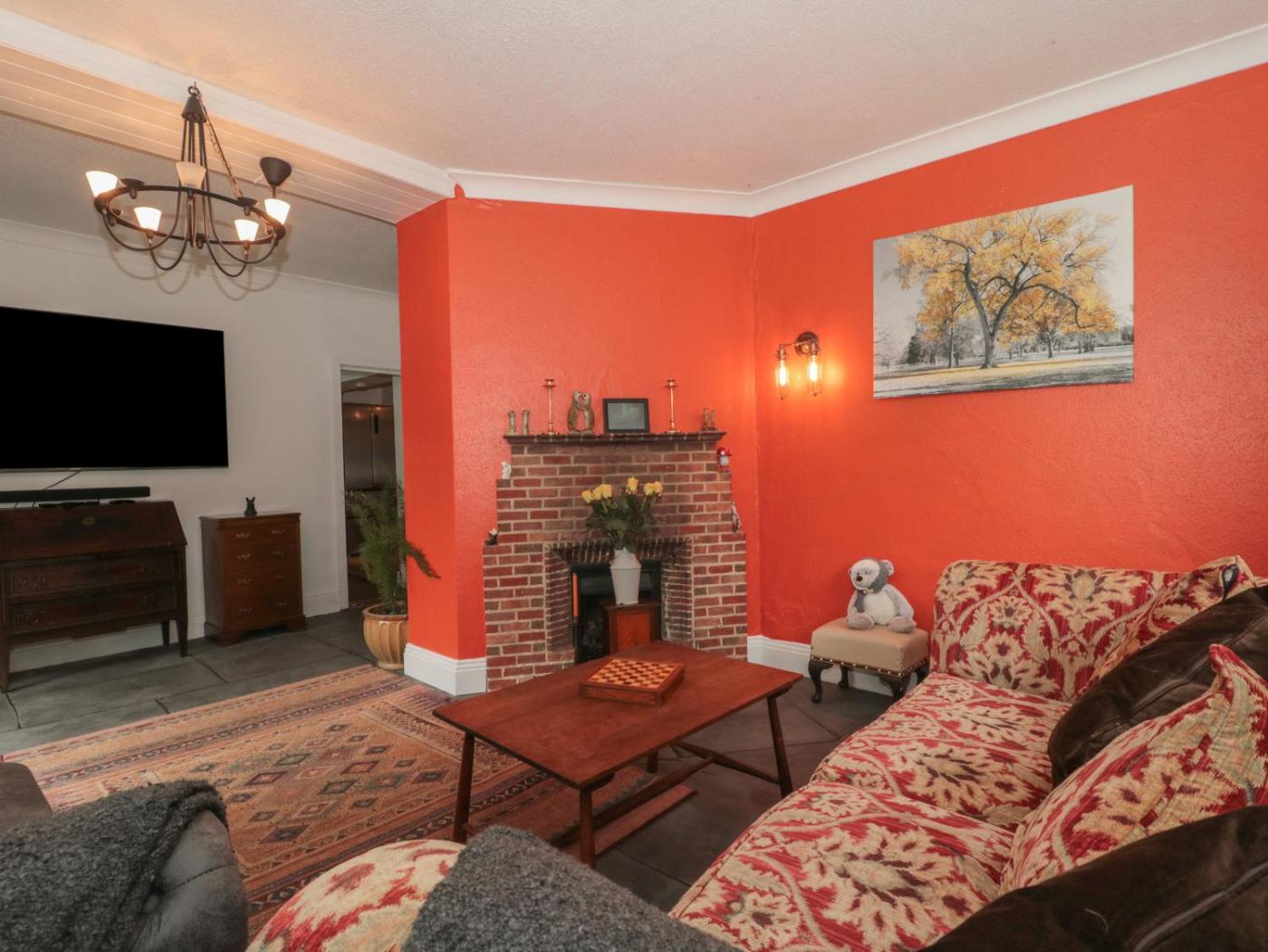The spacious holiday home has 4 bedrooms, a fully equipped kitchen with a dishwasher and an oven, and 2 bathrooms with a walk-in shower and hot tub. There is also a seating area and a fireplace.
